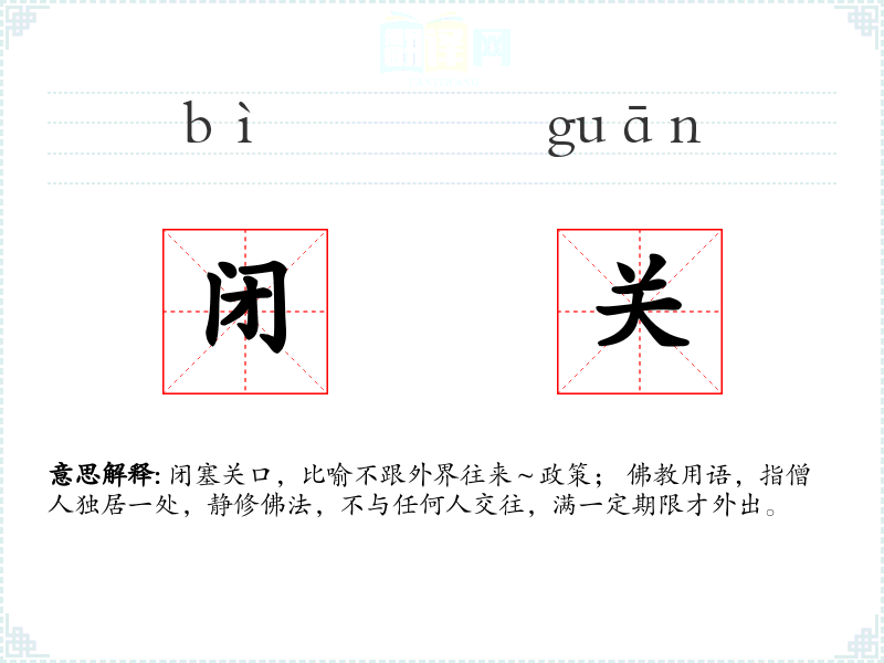 闭塞关口,比喻不跟外界往来~政策; 佛教用语,指僧人独居一处,静修佛法,不与任何人交往,满一定期限才外出。