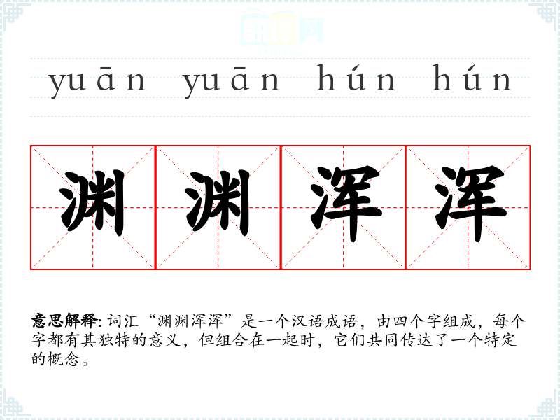 词汇“渊渊浑浑”是一个汉语成语,由四个字组成,每个字都有其独特的意义,但组合在一起时,它们共同传达了一个特定的概念。