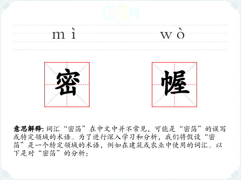 词汇“密箔”在中文中并不常见,可能是“密箔”的误写或特定领域的术语。为了进行深入学*和分析,我们将假设“密箔”是一个特定领域的术语,例如在建筑或农业中使用的词汇。以下是对“密箔”的分析: