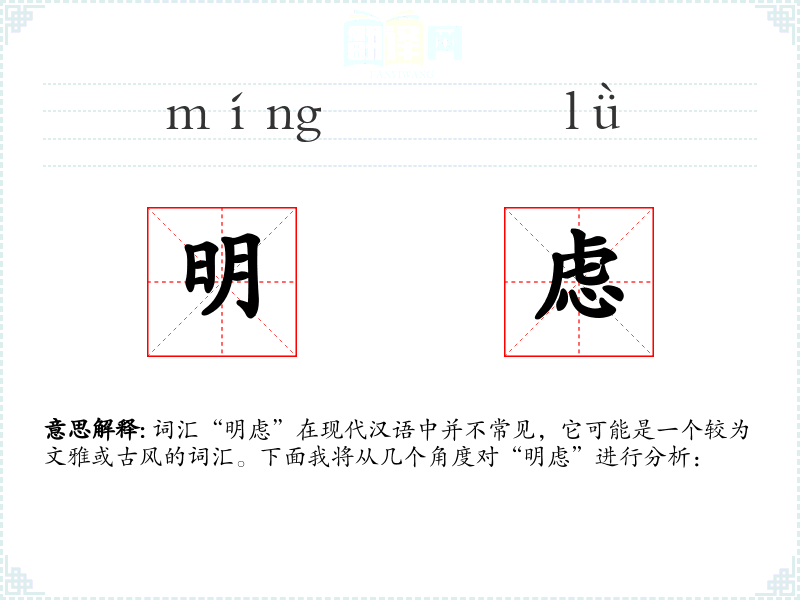 词汇“明虑”在现代汉语中并不常见,它可能是一个较为文雅或古风的词汇。下面我将从几个角度对“明虑”进行分析: