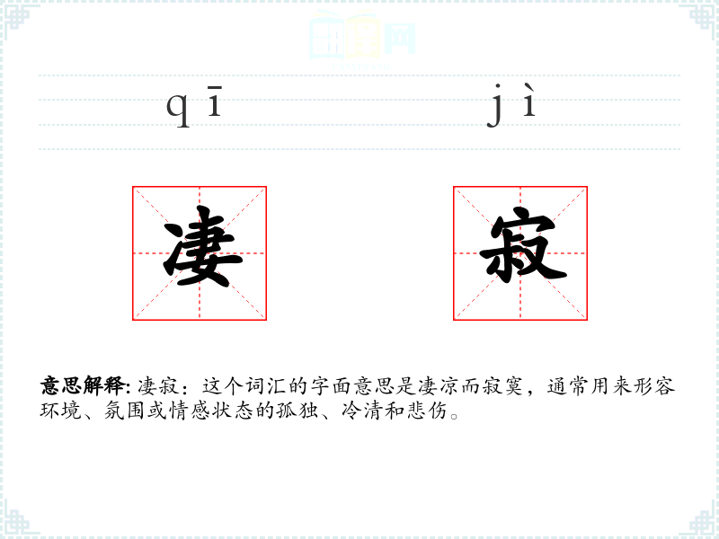 凄寂:这个词汇的字面意思是凄凉而寂寞,通常用来形容环境、氛围或情感状态的孤独、冷清和悲伤。