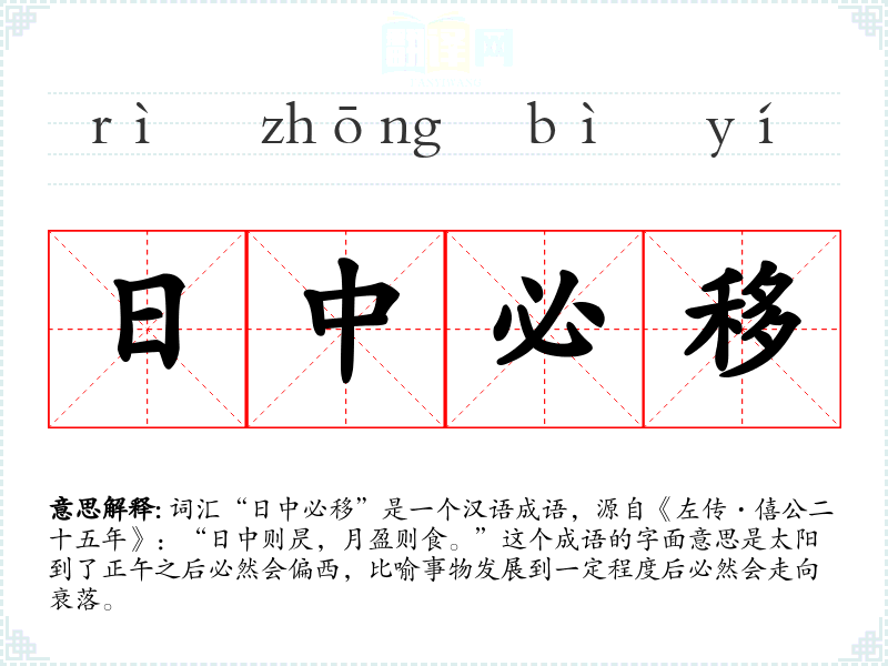 词汇“日中必移”是一个汉语成语,源自《左传·僖公二十五年》:“日中则昃,月盈则食。”这个成语的字面意思是太阳到了正午之后必然会偏西,比喻事物发展到一定程度后必然会走向衰落。
