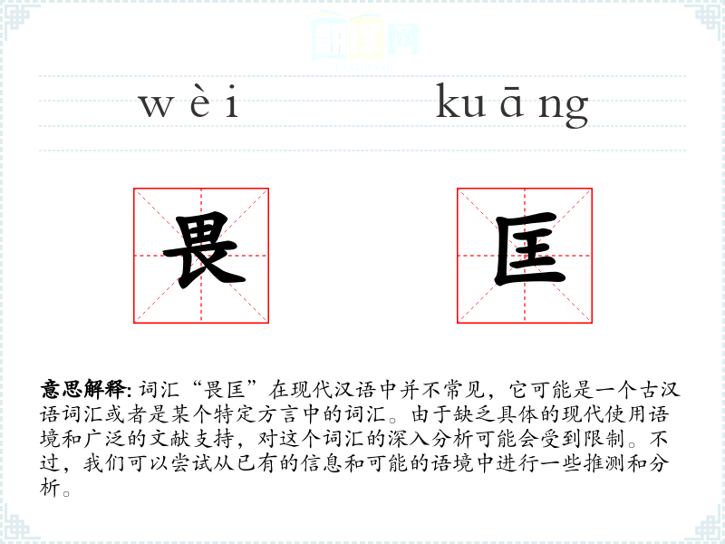 词汇“畏匡”在现代汉语中并不常见,它可能是一个古汉语词汇或者是某个特定方言中的词汇。由于缺乏具体的现代使用语境和广泛的文献支持,对这个词汇的深入分析可能会受到限制。不过,我们可以尝试从已有的信息和可能的语境中进行一些推测和分析。