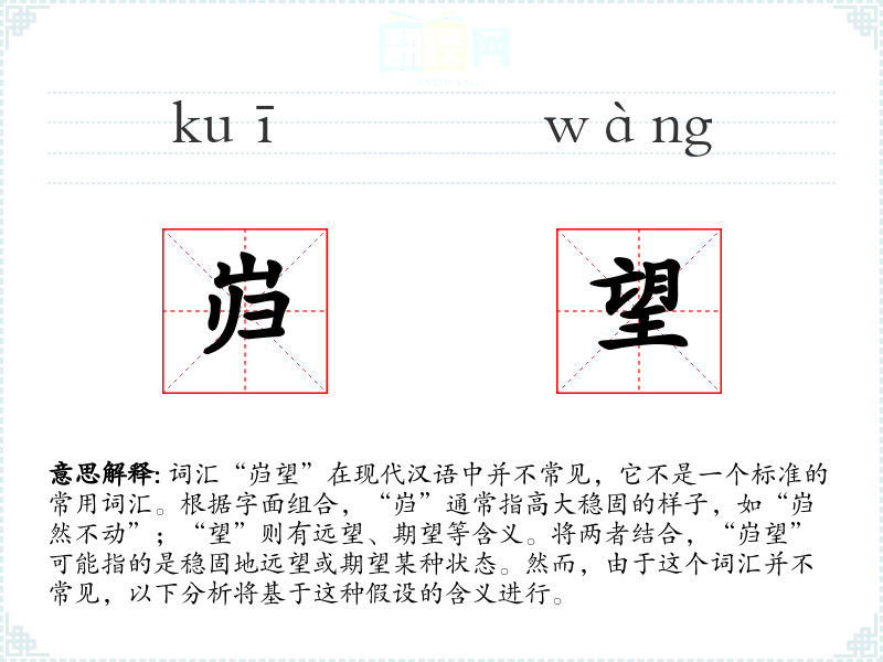 词汇“岿望”在现代汉语中并不常见,它不是一个标准的常用词汇。根据字面组合,“岿”通常指高大稳固的样子,如“岿然不动”;“望”则有远望、期望等含义。将两者结合,“岿望”可能指的是稳固地远望或期望某种状态。然而,由于这个词汇并不常见,以下分析将基于这种假设的含义进行。