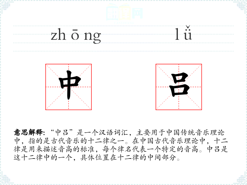 “中吕”是一个汉语词汇,主要用于传统音乐理论中,指的是古代音乐的十二律之一。在古代音乐理论中,十二律是用来描述音高的标准,每个律名代表一个特定的音高。中吕是这十二律中的一个,具体位置在十二律的中间部分。