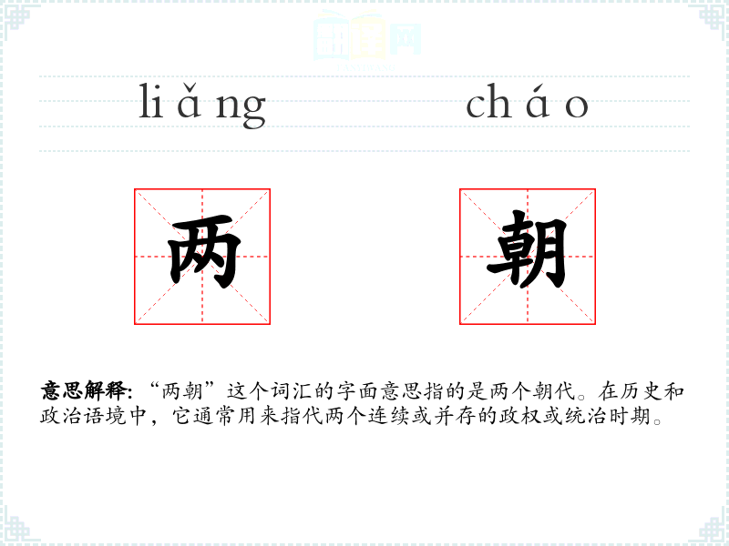 “两朝”一词源于古代汉语,其中“两”表示数量,“朝”指代朝代或政权。随着历史的发展,这个词逐渐固定用来描述两个连续或并存的朝代。