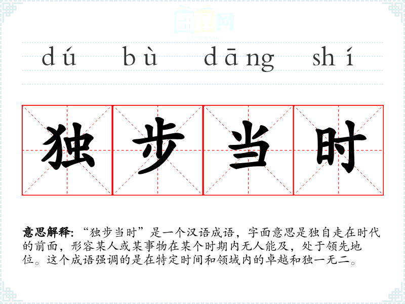 “独步当时”是一个汉语成语,字面意思是独自走在时代的前面,形容某人或某事物在某个时期内无人能及,处于领先地位。这个成语强调的是在特定时间和领域内的卓越和独一无二。