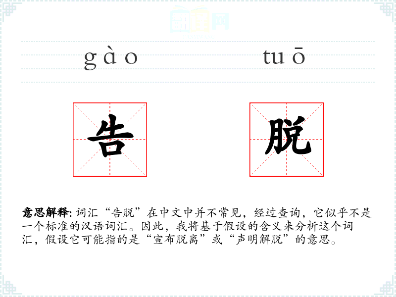 词汇“告脱”在中文中并不常见,经过查询,它似乎不是一个标准的汉语词汇。因此,我将基于假设的含义来分析这个词汇,假设它可能指的是“宣布脱离”或“声明解脱”的意思。