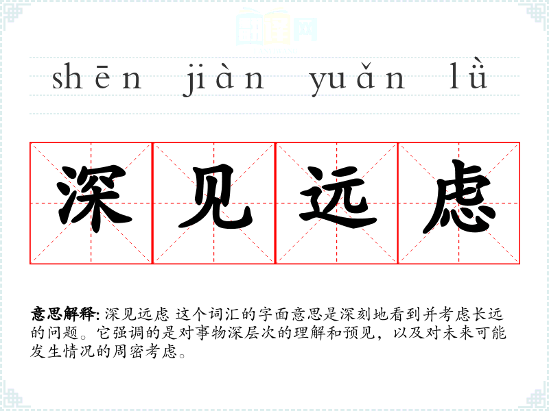 深见远虑 这个词汇的字面意思是深刻地看到并考虑长远的问题。它强调的是对事物深层次的理解和预见,以及对未来可能发生情况的周密考虑。