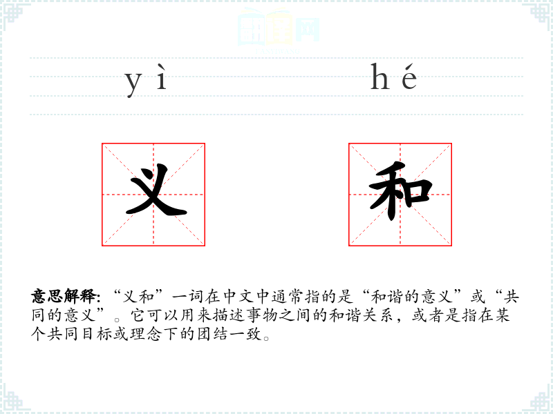 “义和”一词在中文中通常指的是“和谐的意义”或“共同的意义”。它可以用来描述事物之间的和谐关系,或者是指在某个共同目标或理念下的团结一致。