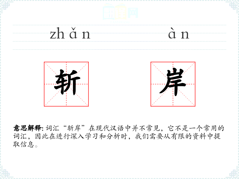 “斩”字在古代汉语中有砍断、切断的意思,“岸”指河岸。组合起来,“斩岸”即砍断河岸。这个词可能在古代文献中出现,但随着时间的推移,它在现代汉语中的使用频率大大降低。