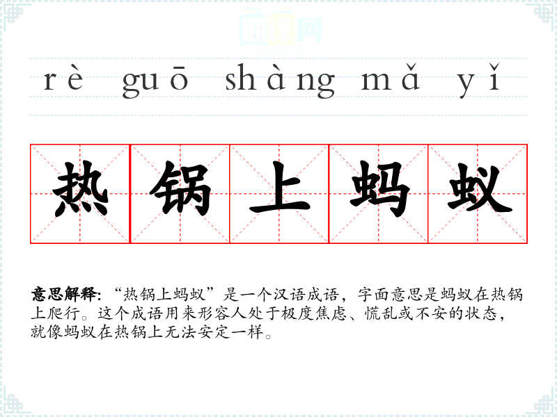“热锅上蚂蚁”是一个汉语成语,字面意思是蚂蚁在热锅上爬行。这个成语用来形容人处于极度焦虑、慌乱或不安的状态,就像蚂蚁在热锅上无法安定一样。