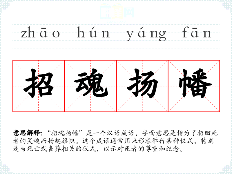 在*传统文化中,丧葬仪式被视为非常重要的一部分,涉及到对死者的尊重和纪念。因此,“招魂扬幡”这个成语反映了这种文化价值观和社会俗。在现代社会,虽然这种具体的仪式可能不再常见,但这个成语仍然被用来描述类似的情感和场景。