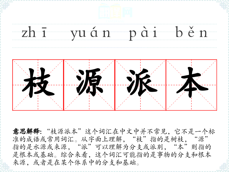 由于“枝源派本”不是一个常用词汇,它的词源和演变历史不详。它可能是由几个常用词汇组合而成,用以表达特定的概念或思想。