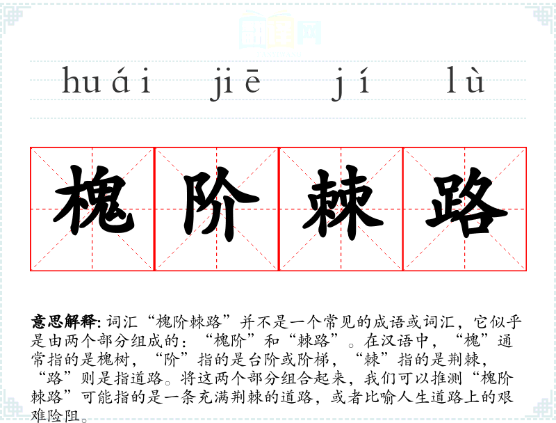 词汇“槐阶棘路”并不是一个常见的成语或词汇,它似乎是由两个部分组成的:“槐阶”和“棘路”。在汉语中,“槐”通常指的是槐树,“阶”指的是台阶或阶梯,“棘”指的是荆棘,“路”则是指道路。将这两个部分组合起来,我们可以推测“槐阶棘路”可能指的是一条充满荆棘的道路,或者比喻人生道路上的艰难险阻。