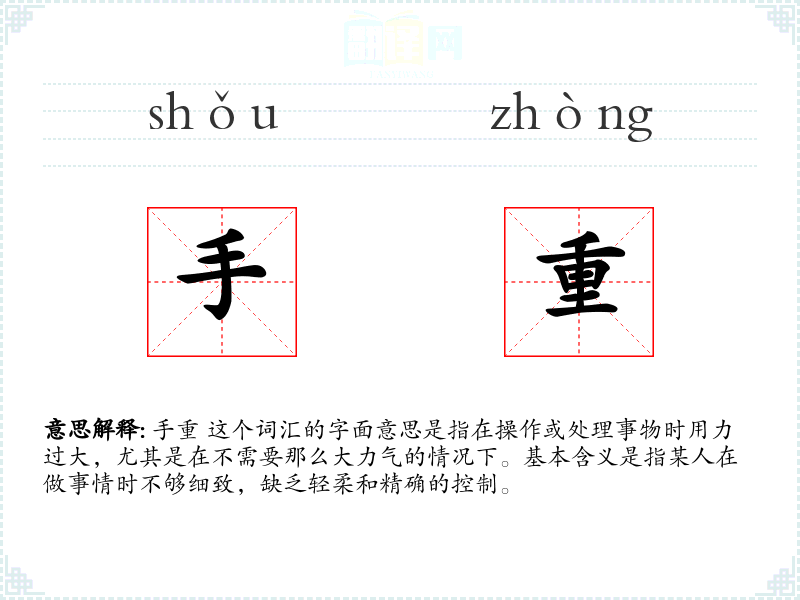 手重 这个词汇的字面意思是指在操作或处理事物时用力过大,尤其是在不需要那么大力气的情况下。基本含义是指某人在做事情时不够细致,缺乏轻柔和精确的控制。