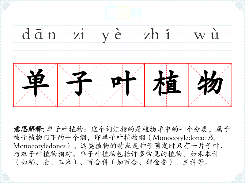 单子叶植物:这个词汇指的是植物学中的一个分类,属于被子植物门下的一个纲,即单子叶植物纲(Monocotyledonae 或 Monocotyledones)。这类植物的特点是种子萌发时只有一片子叶,与双子叶植物相对。单子叶植物包括许多常见的植物,如禾本科(如稻、麦、玉米)、百合科(如百合、郁金香)、兰科等。