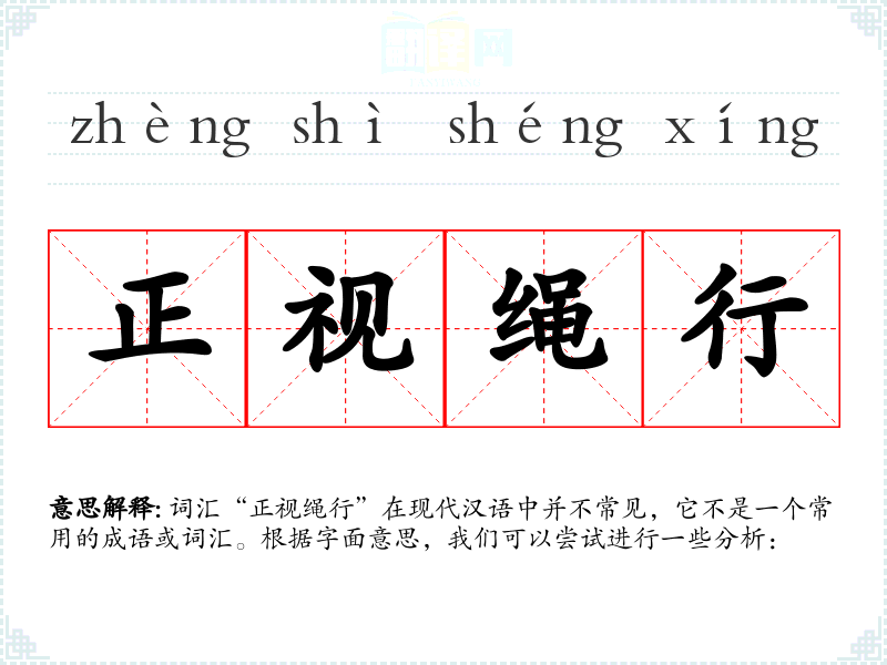 词汇“正视绳行”在现代汉语中并不常见,它不是一个常用的成语或词汇。根据字面意思,我们可以尝试进行一些分析: