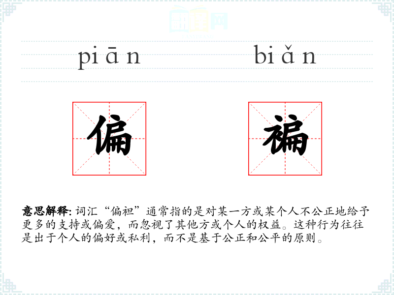 词汇“偏袒”通常指的是对某一方或某个人不公正地给予更多的支持或偏爱,而忽视了其他方或个人的权益。这种行为往往是出于个人的偏好或私利,而不是基于公正和公平的原则。