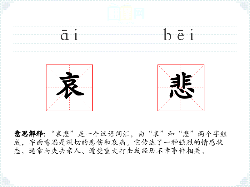 “哀悲”中的“哀”字最早见于甲骨文,原意是哭泣,后来引申为悲伤。“悲”字则有悲伤、哀痛的意思。这两个字组合在一起,强调了悲伤的深度和强度。