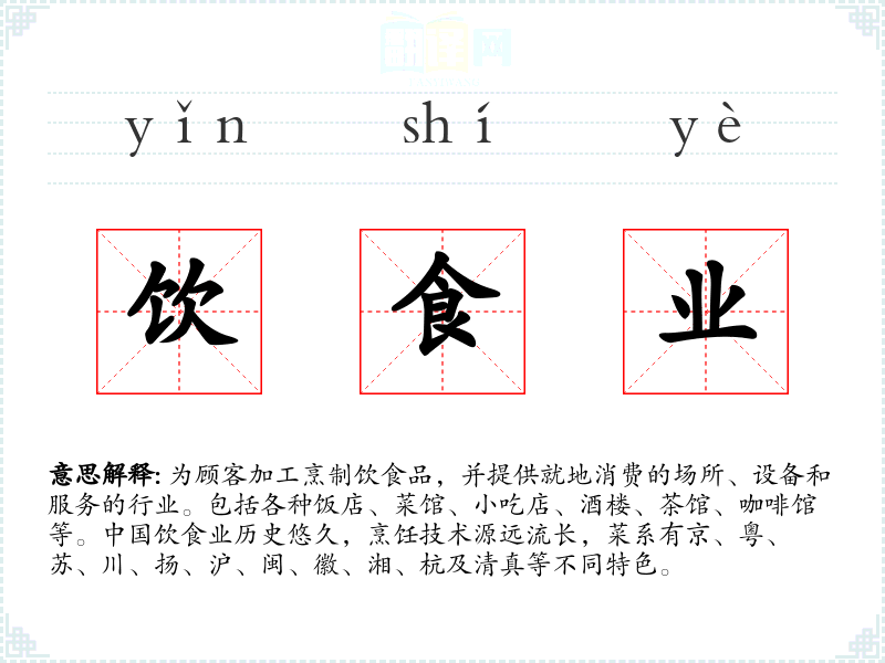 1.为顾客加工烹制饮食品,并提供就地消费的场所、设备和服务的行业。包括各种饭店、菜馆、小吃店、酒楼、茶馆、咖啡馆等。中国饮食业历史悠久,烹饪技术源远流长,菜系有京、粤、苏、川、扬、沪、闽、徽、湘、杭及清真等不同特色。