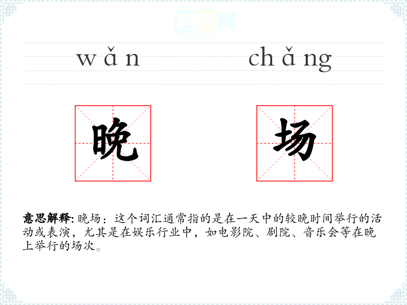晚场:这个词汇通常指的是在一天中的较晚时间举行的活动或表演,尤其是在娱乐行业中,如电影院、剧院、音乐会等在晚上举行的场次。