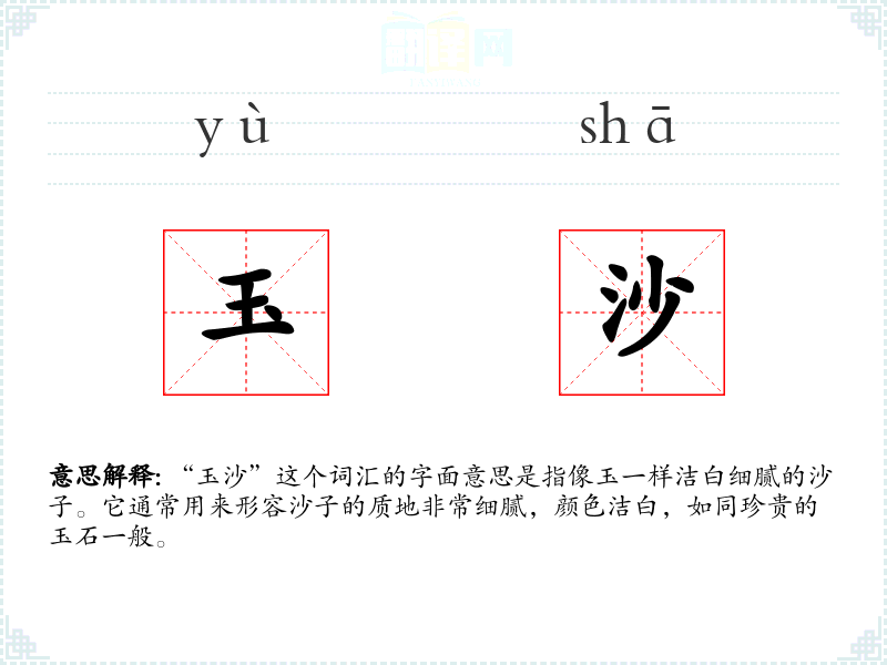 “玉沙”这个词汇的字面意思是指像玉一样洁白细腻的沙子。它通常用来形容沙子的质地非常细腻,颜色洁白,如同珍贵的玉石一般。