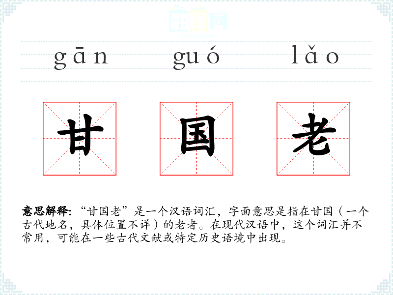 “甘国老”是一个汉语词汇,字面意思是指在甘国(一个古代地名,具体位置不详)的老者。在现代汉语中,这个词汇并不常用,可能在一些古代文献或特定历史语境中出现。