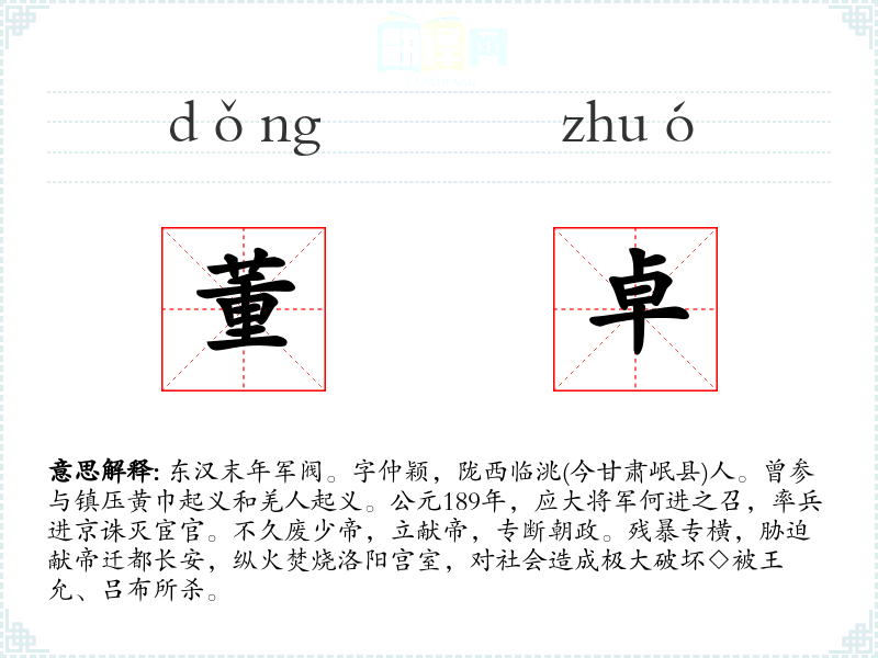 1.东汉末年军阀。字仲颖,陇西临洮(今甘肃岷县)人。曾参与镇压黄巾起义和羌人起义。公元189年,应大将军何进之召,率兵进京诛灭宦官。不久废少帝,立献帝,专断朝政。残暴专横,胁迫献帝迁都长安,纵火焚烧洛阳宫室,对社会造成极大破坏◇被王允、吕布所杀。