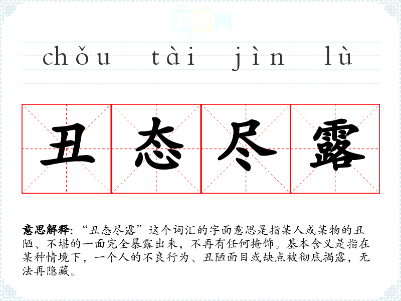 “丑态尽露”这个词汇的词源较为直接,由“丑态”和“尽露”两个词组合而成。在古代汉语中,“丑态”指的是丑陋的姿态或行为,“尽露”则表示完全暴露。随着语言的发展,这个词汇被广泛用于描述人的不良行为或缺点被彻底揭露的情境。