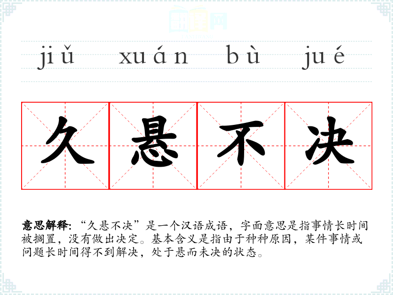 “久悬不决”是一个汉语成语,字面意思是指事情长时间被搁置,没有做出决定。基本含义是指由于种种原因,某件事情或问题长时间得不到解决,处于悬而未决的状态。