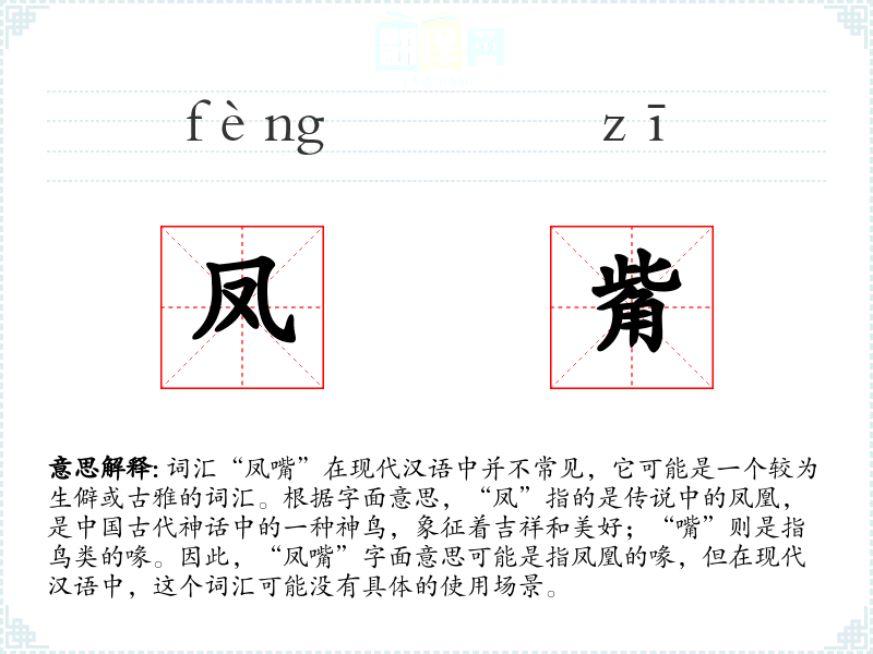 由于“凤嘴”在现代汉语中不常见,它可能出现在古文、诗词或者特定的文学作品中,用以形容某种美好或珍贵的事物。在口语或专业领域中,这个词汇可能不会被使用。