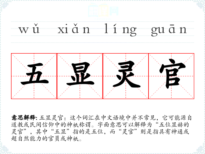 五显灵官:这个词汇在中文语境中并不常见,它可能源自道教或民间信仰中的神祇称谓。字面意思可以解释为“五位显赫的灵官”,其中“五显”指的是五位,而“灵官”则是指具有神通或超自然能力的官员或神祇。