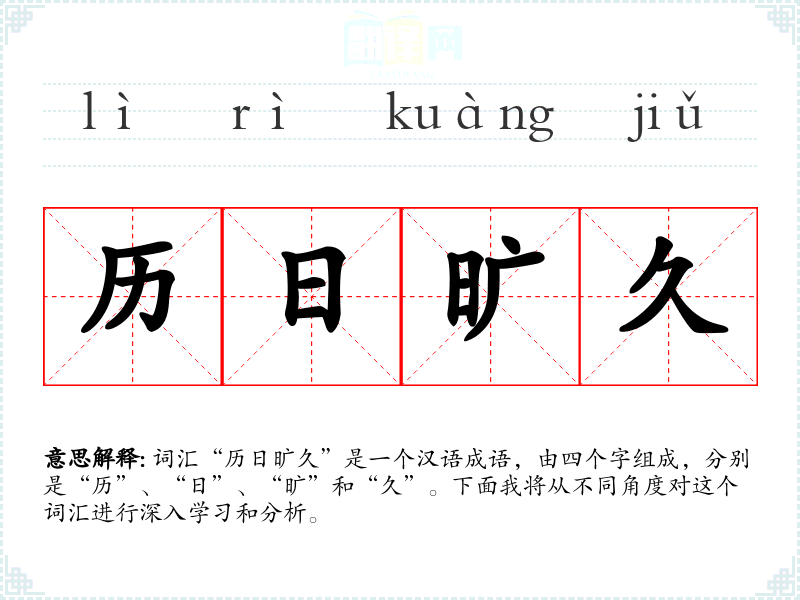 词汇“历日旷久”是一个汉语成语,由四个字组成,分别是“历”、“日”、“旷”和“久”。下面我将从不同角度对这个词汇进行深入学*和分析。