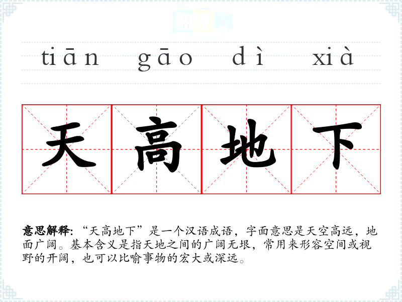 “天高地下”这个成语源自**古代的哲学思想,特别是道家的宇宙观。在古代文献中,如《庄子》等,常有对天地之间关系的探讨,这个成语也因此流传至今。随着时间的推移,其含义逐渐丰富,不仅指物理空间的开阔,也扩展到比喻意义上的宏大和深远。