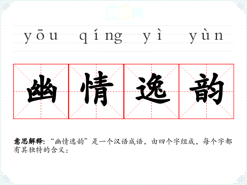“幽情逸韵”是一个汉语成语,由四个字组成,每个字都有其独特的含义: