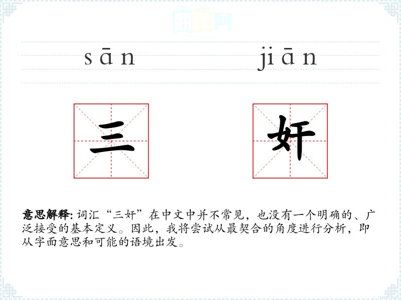 词汇“三奸”在中文中并不常见,也没有一个明确的、广泛接受的基本定义。因此,我将尝试从最契合的角度进行分析,即从字面意思和可能的语境出发。