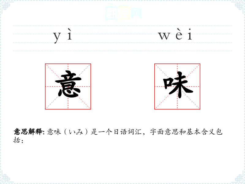 意味(いみ)是一个日语词汇,字面意思和基本含义包括: