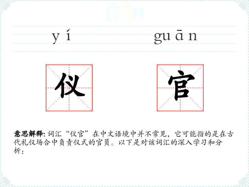 词汇“仪官”在中文语境中并不常见,它可能指的是在古代礼仪场合中负责仪式的官员。以下是对该词汇的深入学*和分析: