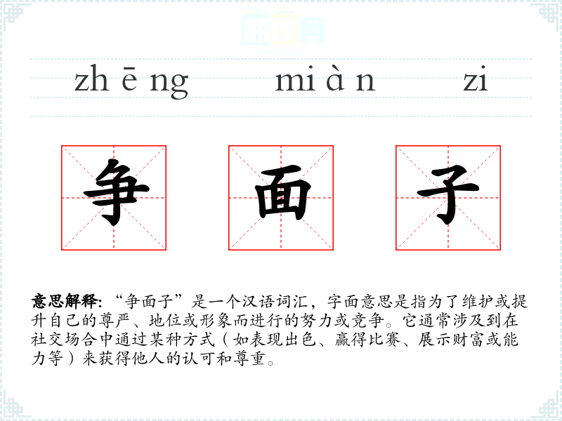 “争面子”是一个汉语词汇,字面意思是指为了维护或提升自己的尊严、地位或形象而进行的努力或竞争。它通常涉及到在社交场合中通过某种方式(如表现出色、赢得比赛、展示财富或能力等)来获得他人的认可和尊重。