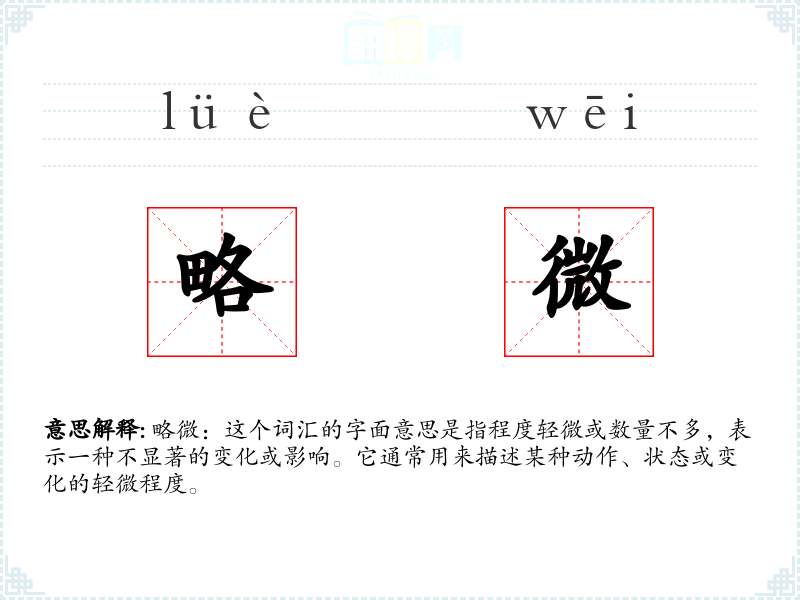 略微:这个词汇的字面意思是指程度轻微或数量不多,表示一种不显著的变化或影响。它通常用来描述某种动作、状态或变化的轻微程度。