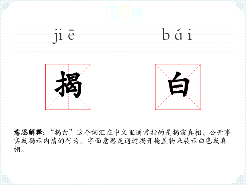 “揭白”这个词汇在中文里通常指的是揭露真相、公开事实或揭示内情的行为。字面意思是通过揭开掩盖物来展示白色或真相。