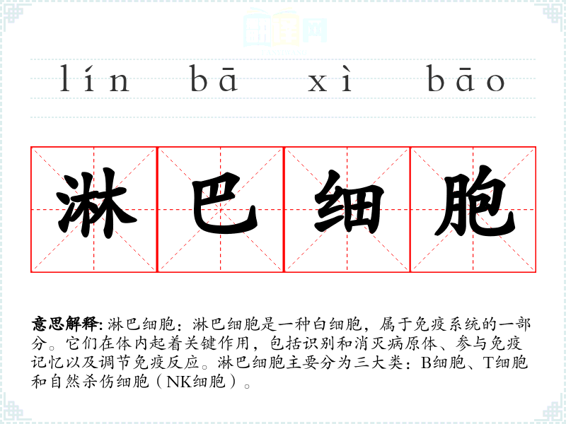 “淋巴细胞”一词源自拉丁语“lympha”(意为“水”或“淋巴”)和希腊语“kytos”(意为“容器”或“细胞”)。随着免疫学的发展,这个词汇在19世纪末被引入科学文献,并逐渐成为描述特定类型白细胞的标准术语。