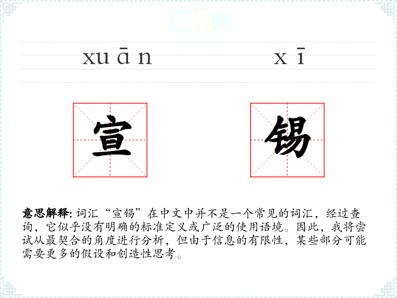 由于“宣锡”不是一个标准词汇,我们无法给出确切的字面意思和基本含义。它可能是某个特定领域或方言中的词汇,或者是某个特定文献中的用语。