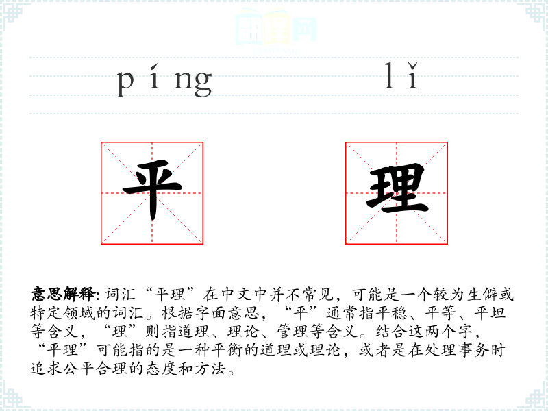- 文学:在文学作品中,“平理”可能用来描述主人公在面对冲突或决策时的公正态度。