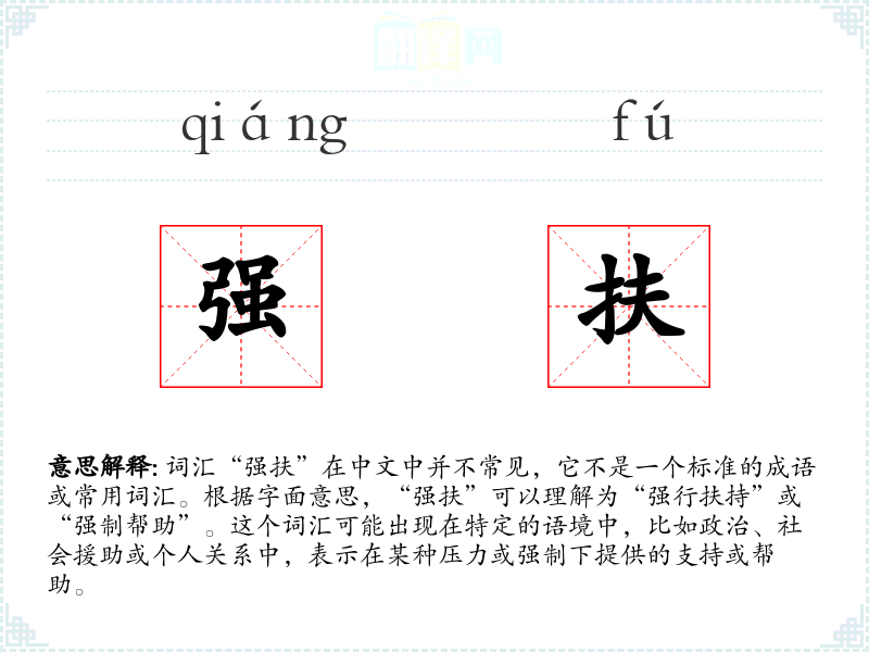 “强扶”这个词汇虽然不常见,但在特定语境中可以有效地表达强制性援助的概念。在语言学习和表达中,了解这样的词汇可以帮助更准确地描述复杂的情境和关系。