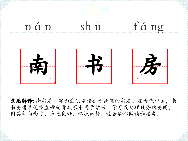 - 口语:在现代口语中,南书房可能更多地被用作比喻,指代一个安静、适合学*或工作的环境。