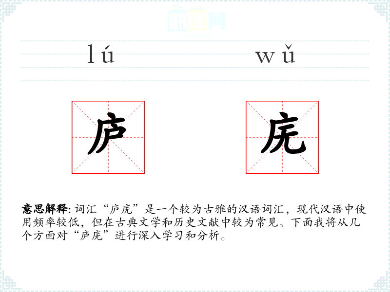 词汇“庐庑”是一个较为古雅的汉语词汇,现代汉语中使用频率较低,但在古典文学和历史文献中较为常见。下面我将从几个方面对“庐庑”进行深入学*和分析。