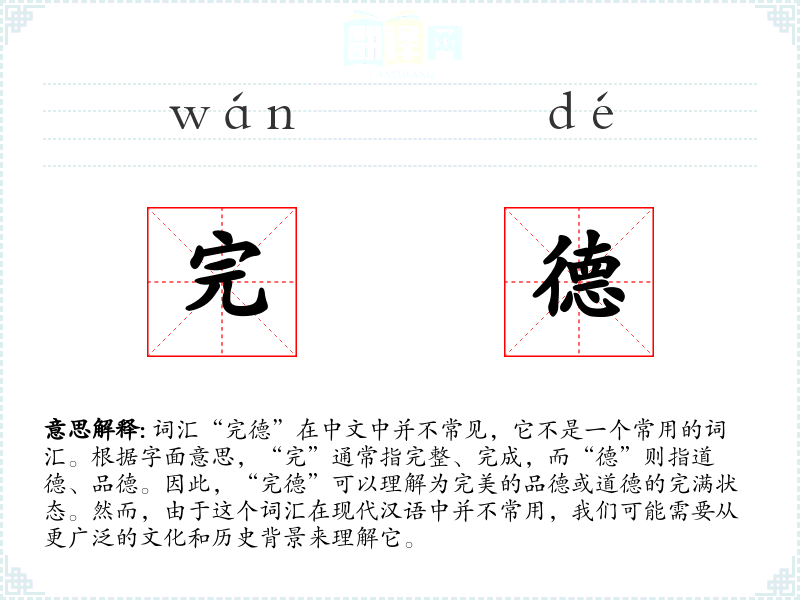 词汇“完德”在中文中并不常见,它不是一个常用的词汇。根据字面意思,“完”通常指完整、完成,而“德”则指道德、品德。因此,“完德”可以理解为完美的品德或道德的完满状态。然而,由于这个词汇在现代汉语中并不常用,我们可能需要从更广泛的文化和历史背景来理解它。
