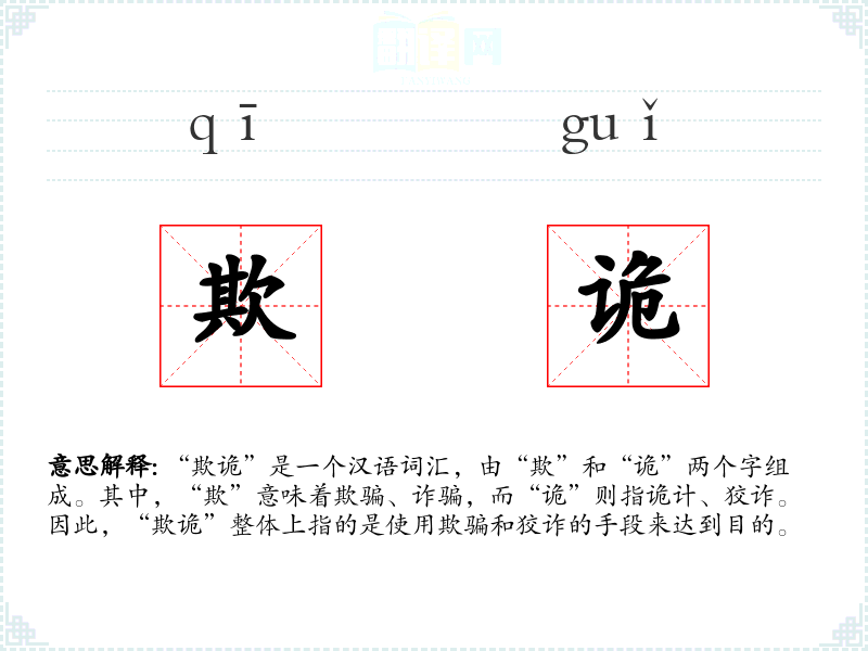 “欺诡”是一个汉语词汇,由“欺”和“诡”两个字组成。其中,“欺”意味着欺骗、诈骗,而“诡”则指诡计、狡诈。因此,“欺诡”整体上指的是使用欺骗和狡诈的手段来达到目的。